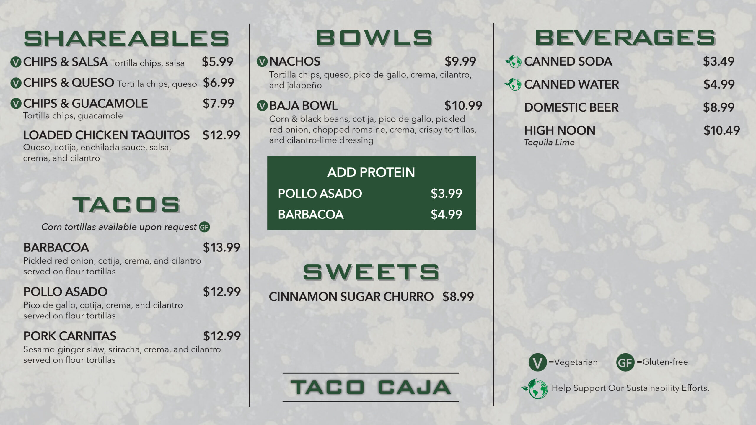 Turn any day into Taco Tuesday with a visit to Taco Caja! Savor our mouthwatering soft tacos filled with flavorful barbacoa, pork carnitas, or pollo adado. Craving more? Enjoy crispy nachos, chips with your choice of guacamole, salsa, or queso, or dive into a fresh and satisfying Baja Bowl. No matter when hunger strikes, Taco Caja has the perfect bite to fuel your adventure!