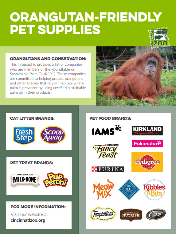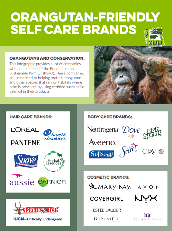 As consumers, we can choose to buy products made with sustainable palm oil as certified by the Roundtable for Sustainable Palm Oil (RSPO). Below is a helpful guide for purchasing items made with certified sustainable palm oil.