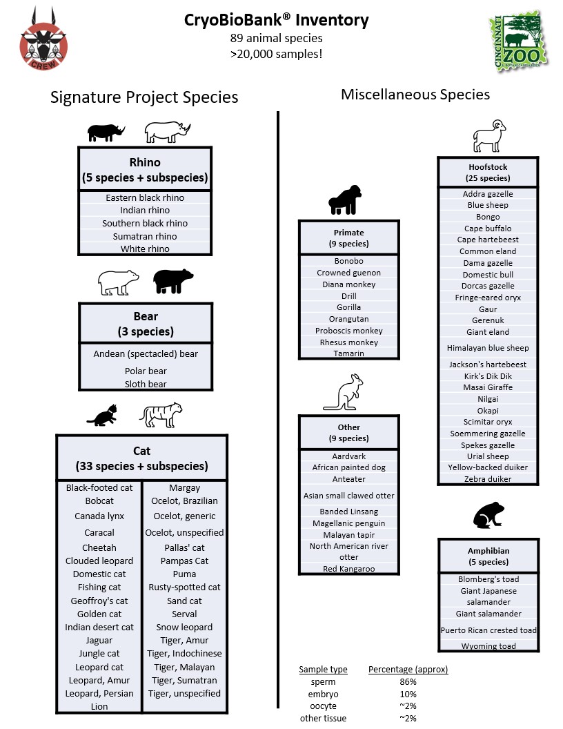 At the heart of The Lindner Center for Conservation and Research of Endangered Wildlife (CREW) is the CryoBioBank®, known scientifically as a genome resource bank. CREW’s CryoBioBank® contains thousands of samples representing hundreds of animal and plant species all stored in tanks of liquid nitrogen at -196° C. Plant samples include seeds, spores, tiny shoot tips and embryos, whereas animal samples include sperm, oocytes (unfertilized eggs) and embryos. Our world-renowned scientists form critical partnerships with other leading conservationists and governmental and non-governmental organizations to achieve CREW’s mission to Save Species with Science®.