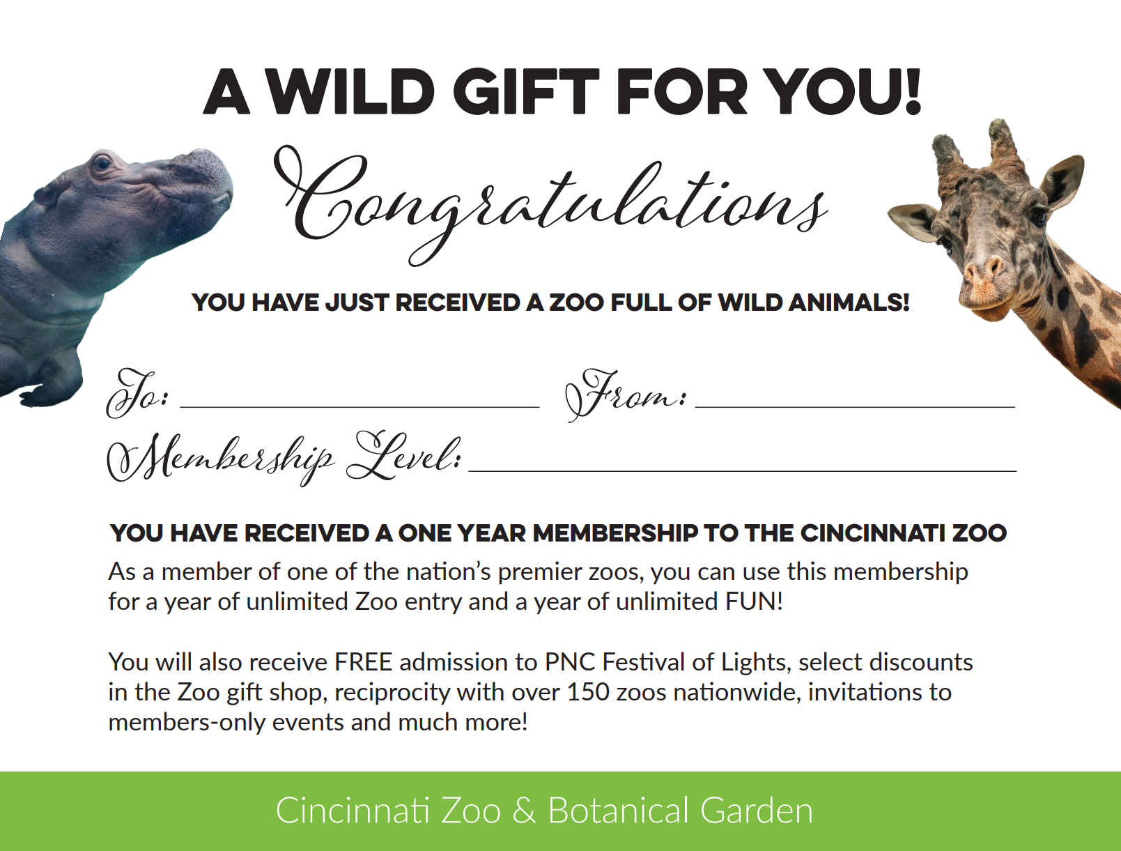 Looking for a wild and unique gift? Give the gift of membership! When you purchase a gift membership, you (as the gift giver) will receive an e-mail confirmation with a PDF gift certificate attached that the recipient will redeem at their convenience to begin their membership. To redeem and activate the gift membership, the recipient will need to call the Member Services Office at (513) 559-7713 or email [email protected]. You will not need any of the recipient’s information to purchase a gift membership.