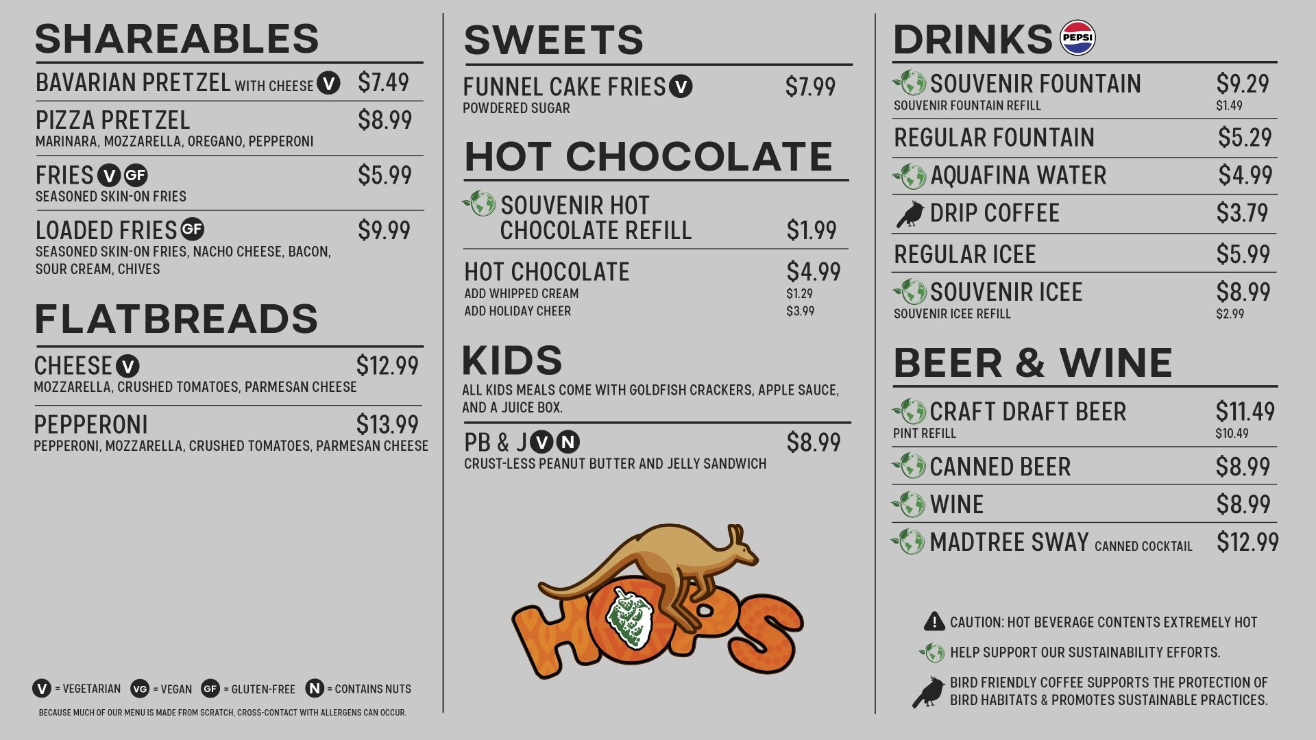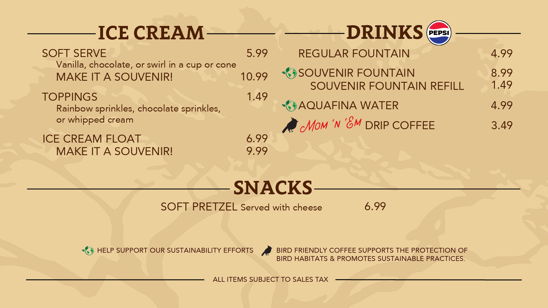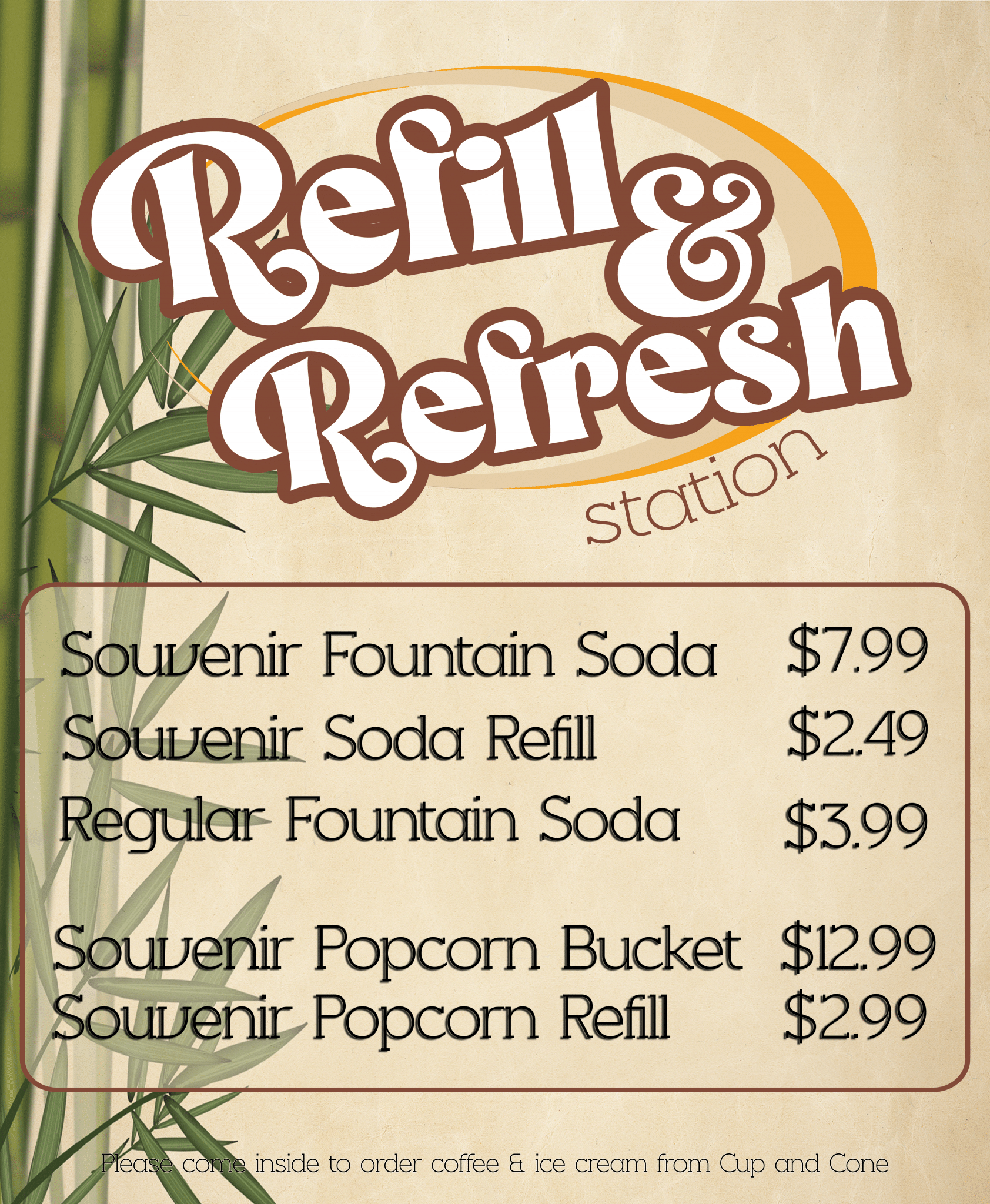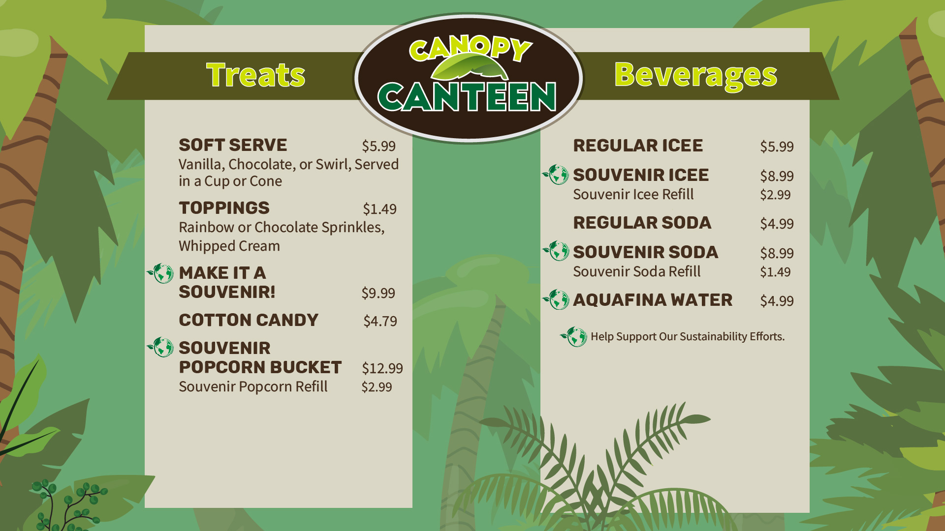 Swing by Canopy Canteen for a delicious treat and a refreshing break! Enjoy creamy Vanilla or Chocolate soft serve in a cup or cake cone, topped with your choice of rainbow or chocolate sprinkles. Craving something extra sweet? We also offer a variety of tasty snacks, ice-cold Pepsi fountain drinks, and our largest selection of ICEE® flavors. Don’t forget—this is also the spot to refill your souvenir popcorn bucket!